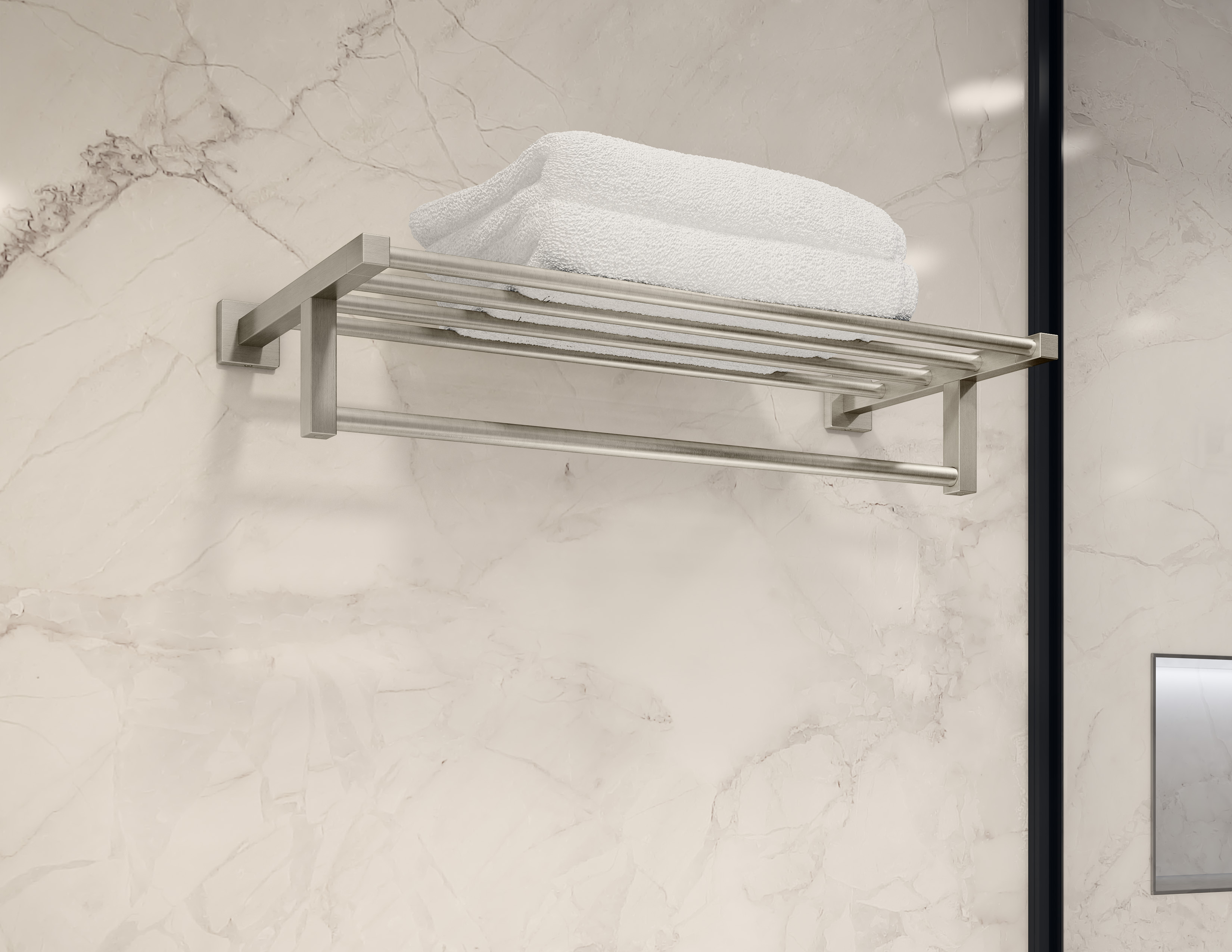 The bold angular design of the Duro Collection reflects the concept of form and function as one ideal. The precise rectangular shapes present a clean, minimalist feel for any contemporary bathroom.