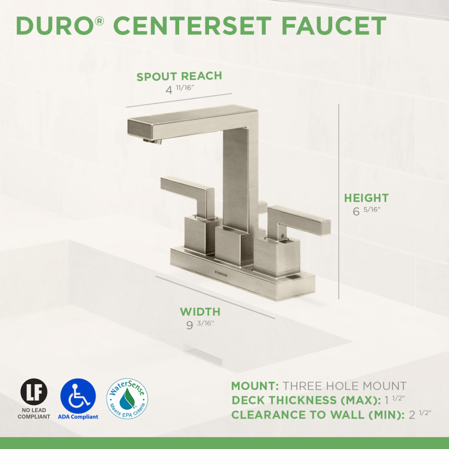 The bold angular design of the Duro Collection reflects the concept of form and function as one ideal. The precise rectangular shapes present a clean, minimalist feel for any contemporary bathroom.