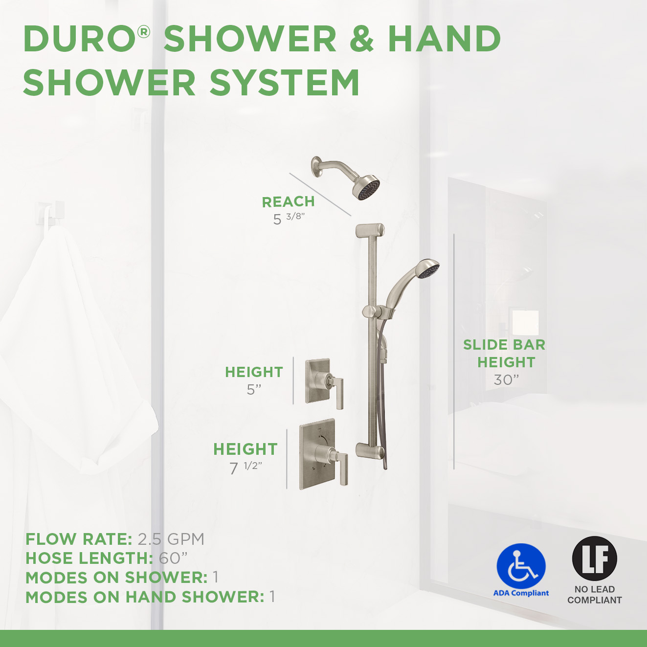 • 30" slide bar for hand shower
