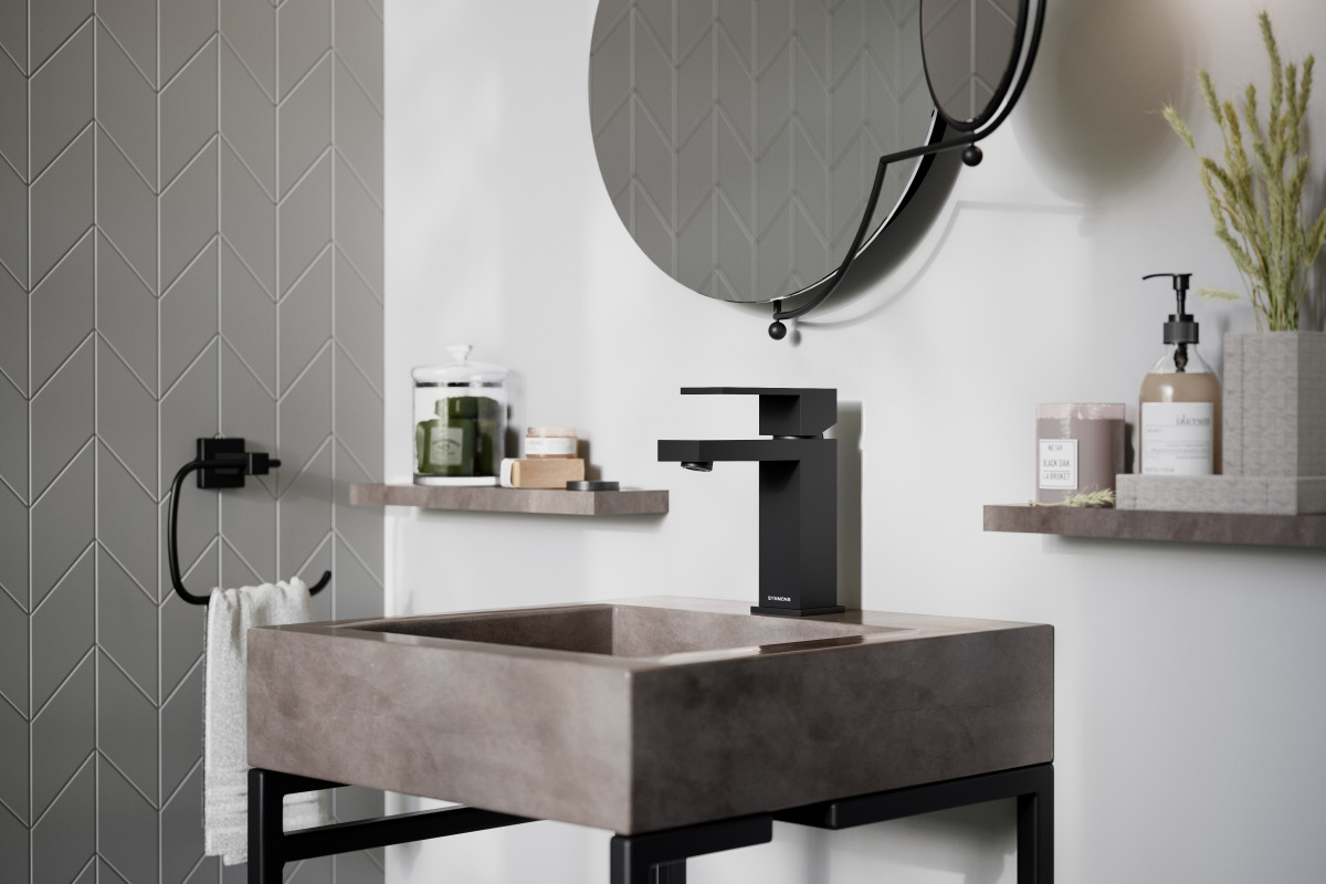 The bold angular design of the Duro Collection reflects the concept of form and function as one ideal. The precise rectangular shapes present a clean, minimalist feel for any contemporary bathroom.