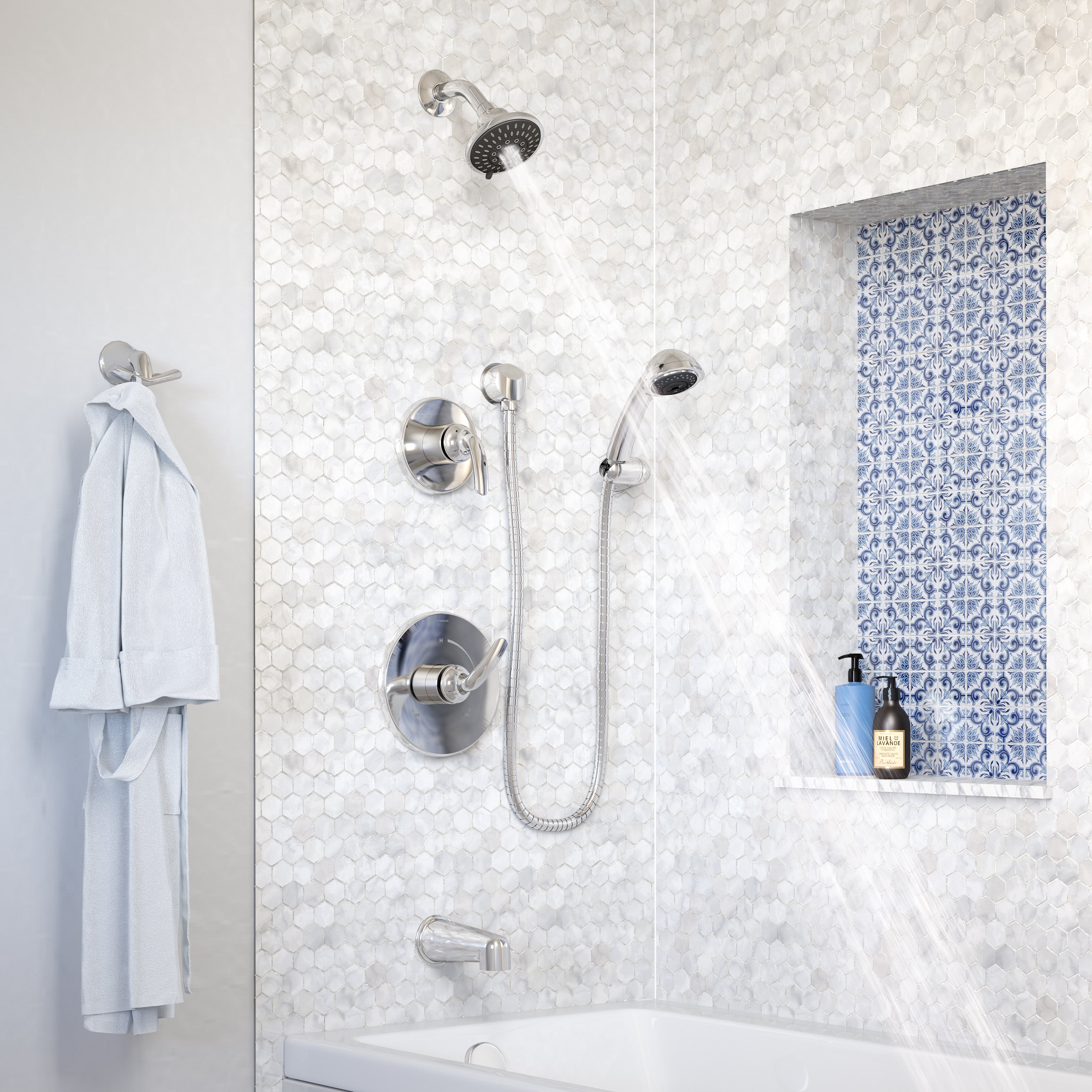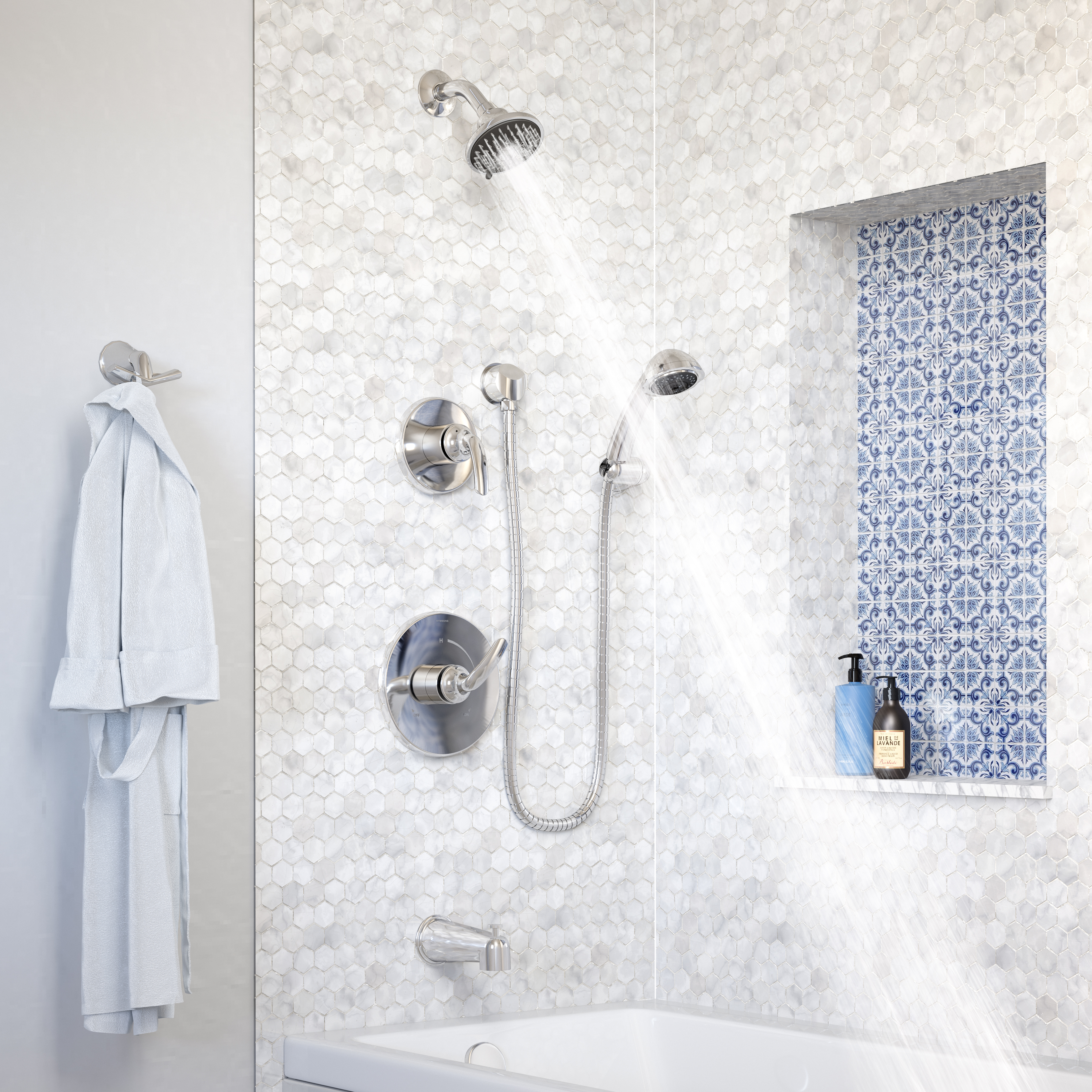 The sleek form and simple lines of the Symmons Elm Collection can be a subtle addition, or choose a bold finish to make it the focal point of any bathroom design.