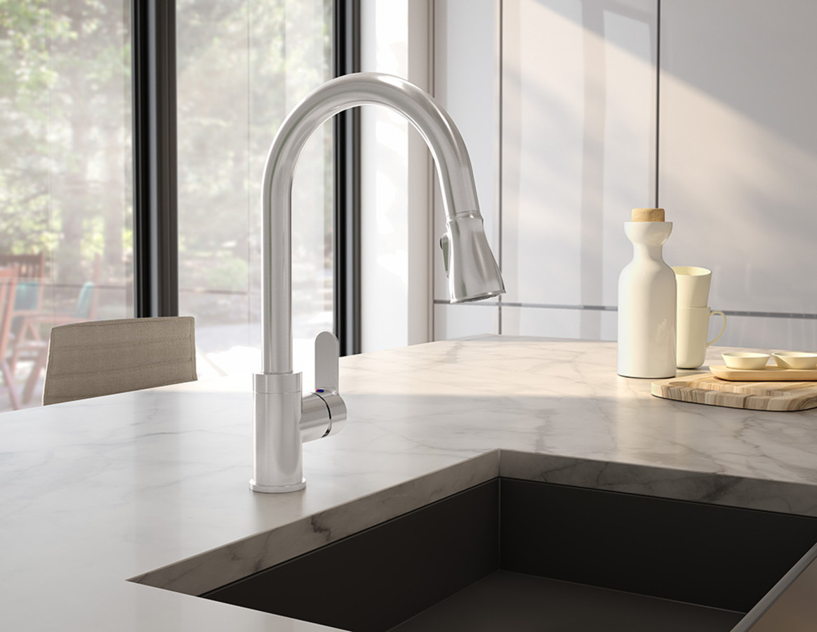 The individuality of recent customer projects inspired the Symmons Identity Collection’s balance of sleek curves and defined edges with stylish simplicity. Its distinct contours bring a modern touch with hints of retro Space Age design.