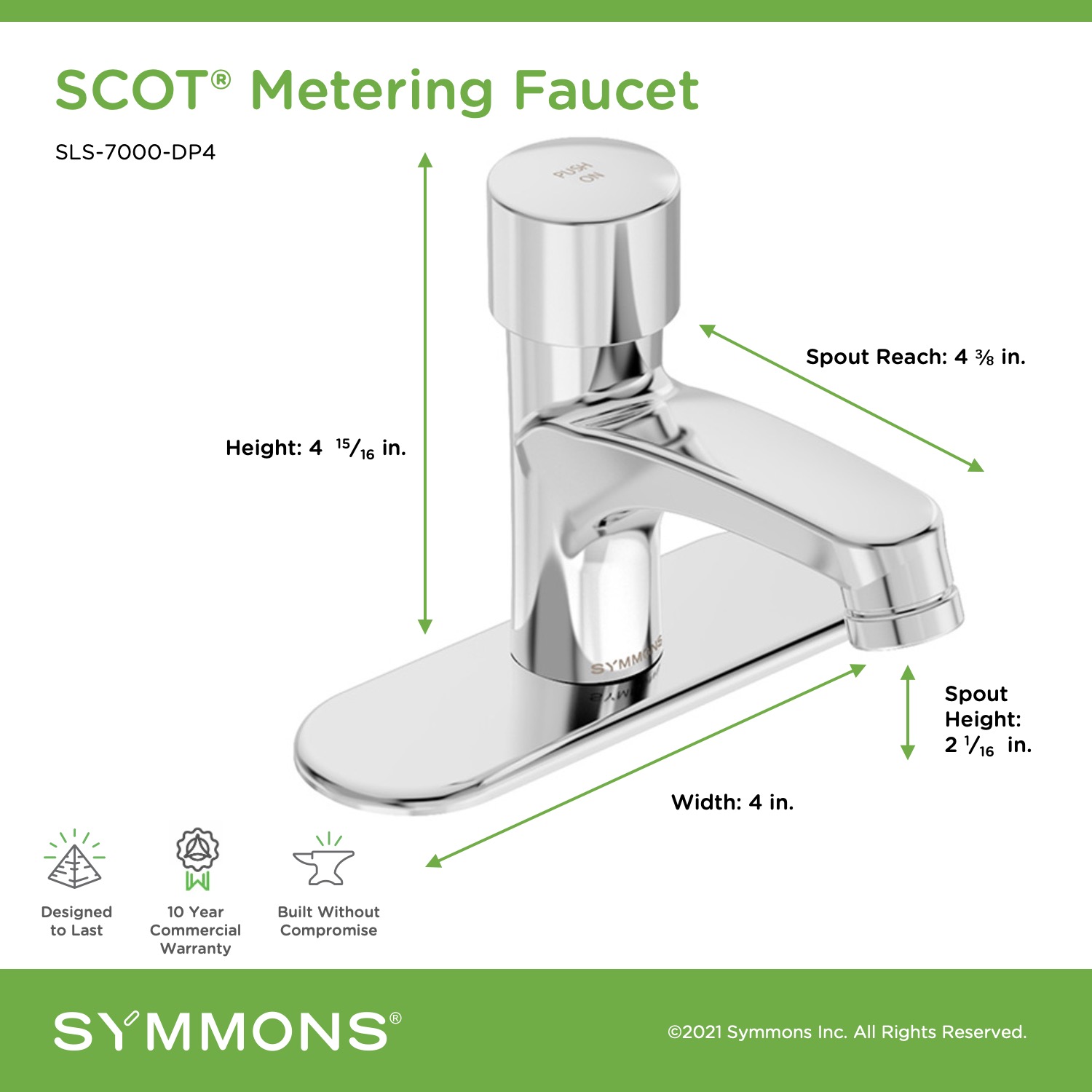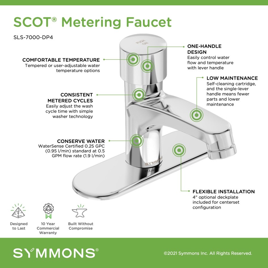 The SCOT/Metering faucet delivers consistent metered wash cycles for commercial, healthcare, hospitality, and other demanding high-use applications. The all-metal body features a deep chrome finish, a self-cleaning cartridge, and the single-lever handle equals fewer parts, easier installation, and lower maintenance. With safety, compliance, and conservation in mind, the SCOT offers the flexibility to adjust both the wash cycle time and the water temperature. The SCOT is also fully compliant with ADA regulations for accessibility and operation.