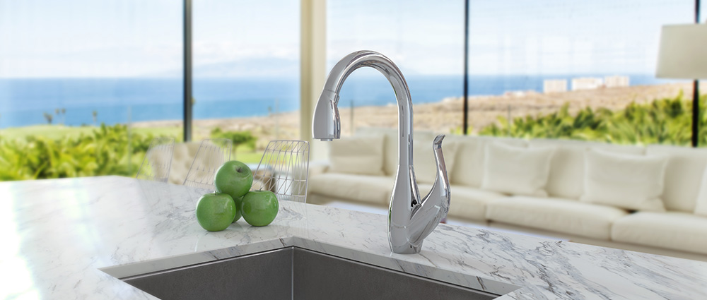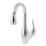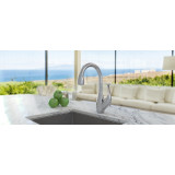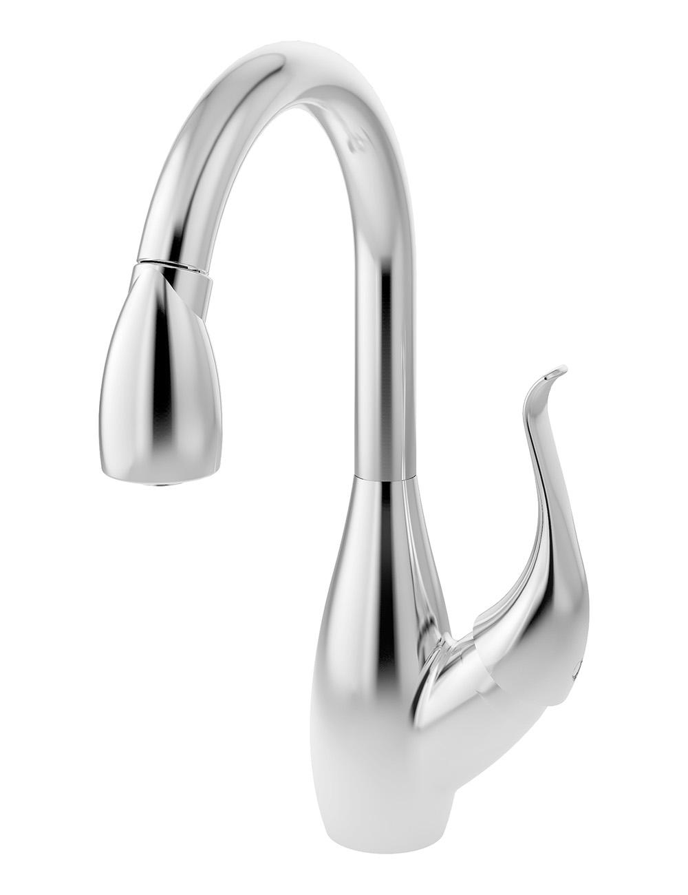 The Symmons Moscato® kitchen faucet showcases elegant curves reminiscent of a bottle of the favored dessert wine. The smooth swivel spout branches out to an elegant lever handle, and the integrated pull-out spray head varies the flow from spray to stream with a simple touch control.