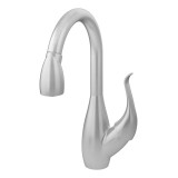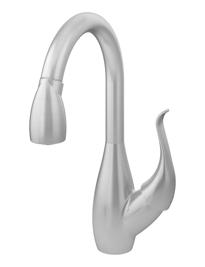 The Symmons Moscato® kitchen faucet showcases elegant curves reminiscent of a bottle of the favored dessert wine. The smooth swivel spout branches out to an elegant lever handle, and the integrated pull-out spray head varies the flow from spray to stream with a simple touch control.