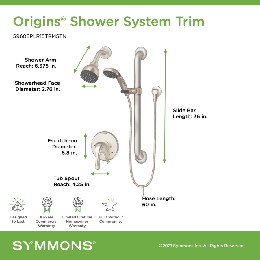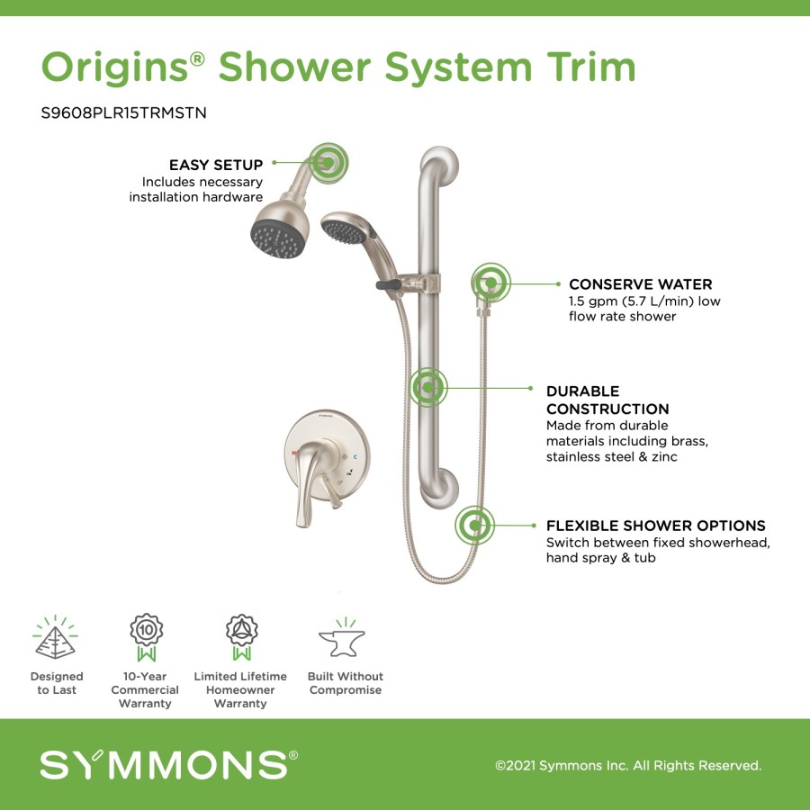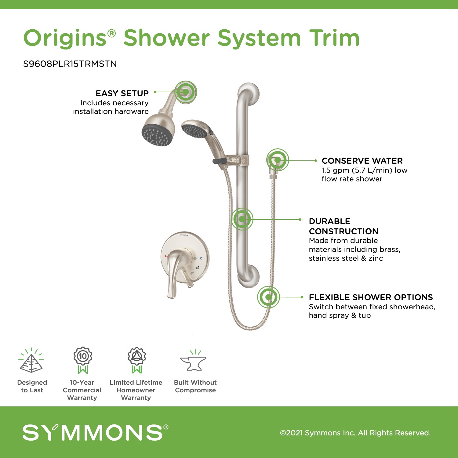 As a combination of three core Symmons products, the Origins Collection combines legendary quality with a fresh stylings for faucets and showers. Powered by Temptrol®, this collection offers easy installation and proven durability with an attractive new design.