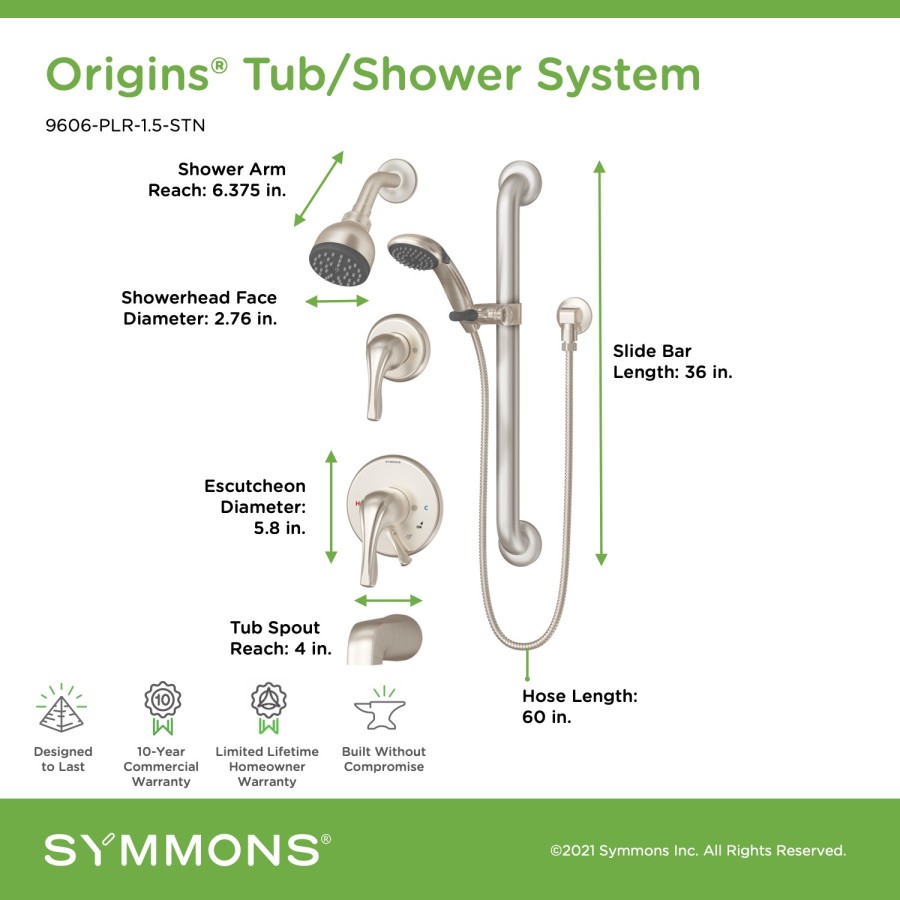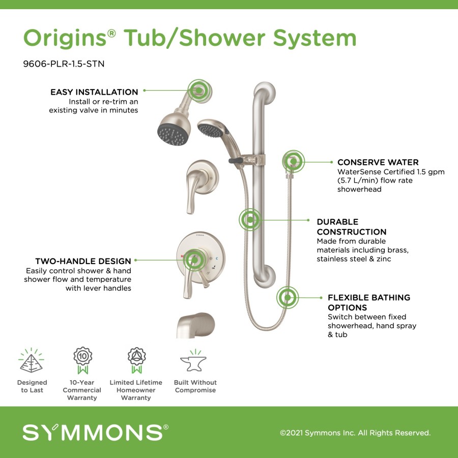 As a combination of three core Symmons products, the Origins Collection combines legendary quality with a fresh stylings for faucets and showers. Powered by Temptrol®, this collection offers easy installation and proven durability with an attractive new design.