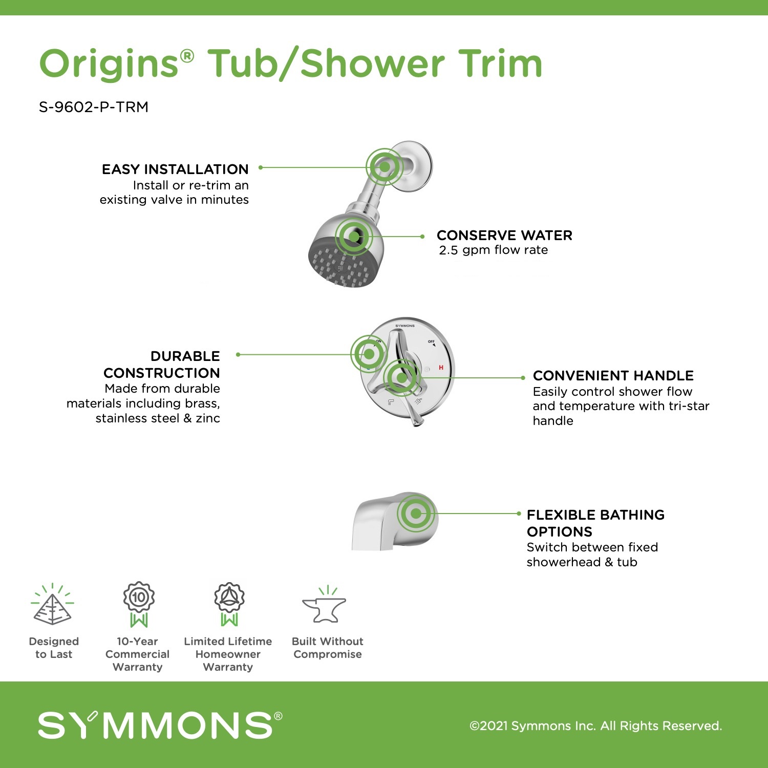 As a combination of three core Symmons products, the Origins Collection combines legendary quality with a fresh stylings for faucets and showers. Powered by Temptrol®, this collection offers easy installation and proven durability with an attractive new design.