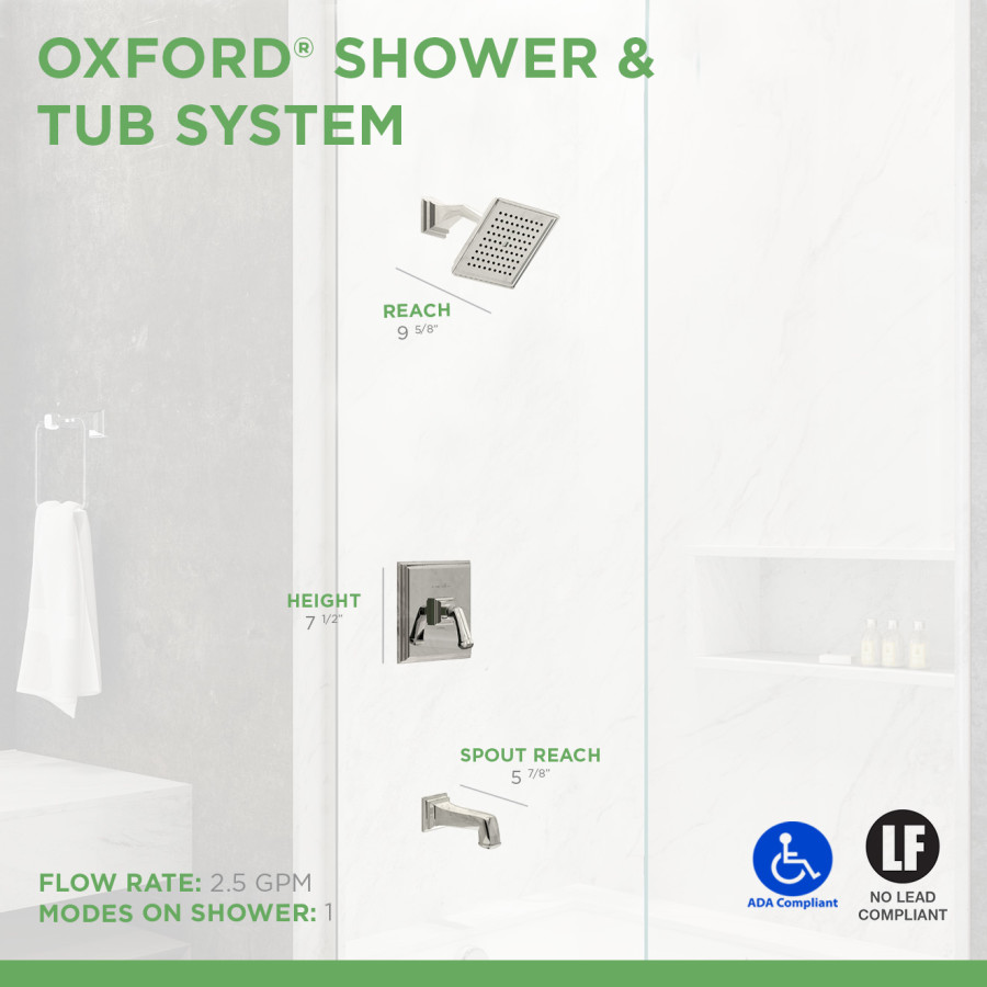 The artful squared aesthetics define the Oxford Collection from Symmons. Its prominent traditional styling is intended to be the focal point of traditional or transitional bath spaces.