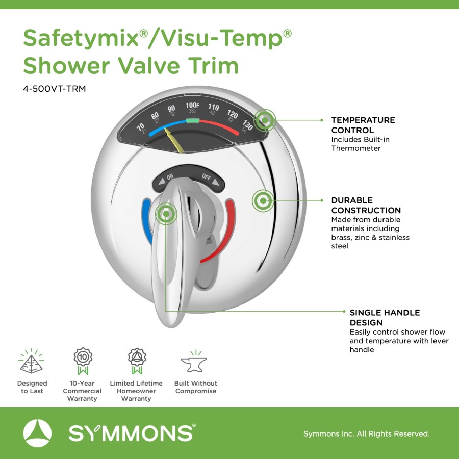 Visu-Temp® Clear-Vue™ shower valves are the perfect choice for specialized care applications. The easy-to-read display and built-in thermometer clearly displays the output water temperature for safety and convenience. With a streamlined single-handle control and durable finish on the outside, the Visu-Temp relies on the Safetymix® pressure-balancing valve behind the wall, which shuts down water flow in the event of failure in hot or cold water supply.