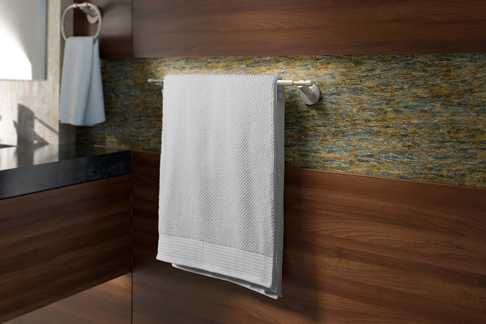 The contemporary design of the Symmons Sereno Collection presents interesting curves and unique stylings to create a minimalist palette that blends with a wide variety of bathroom spaces.