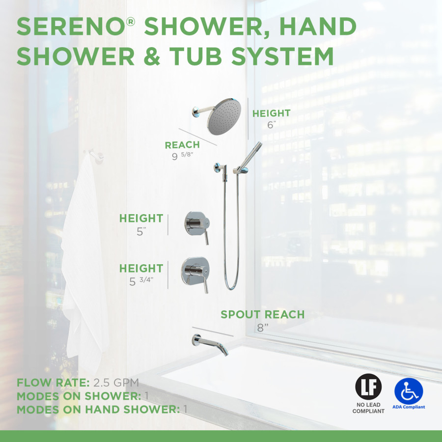 The contemporary design of the Symmons Sereno Collection presents interesting curves and unique stylings to create a minimalist palette that blends with a wide variety of bathroom spaces.