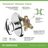 The legendary Temptrol pressure-balancing, anti-scald mixing valve is the heart of every Symmons tub and shower system, and it is the benchmark by which all others are judged. Each valve is constructed of solid brass, bronze, and stainless steel, and features an adjustable piston that instantly and continually balances the hot and cold water pressure as demand fluctuates in the plumbing system. Now Temptrol is even easier to install with the Rapid Install bracket system for virtually any rough-in situation, and factory-installed options for various water supply connection methods.