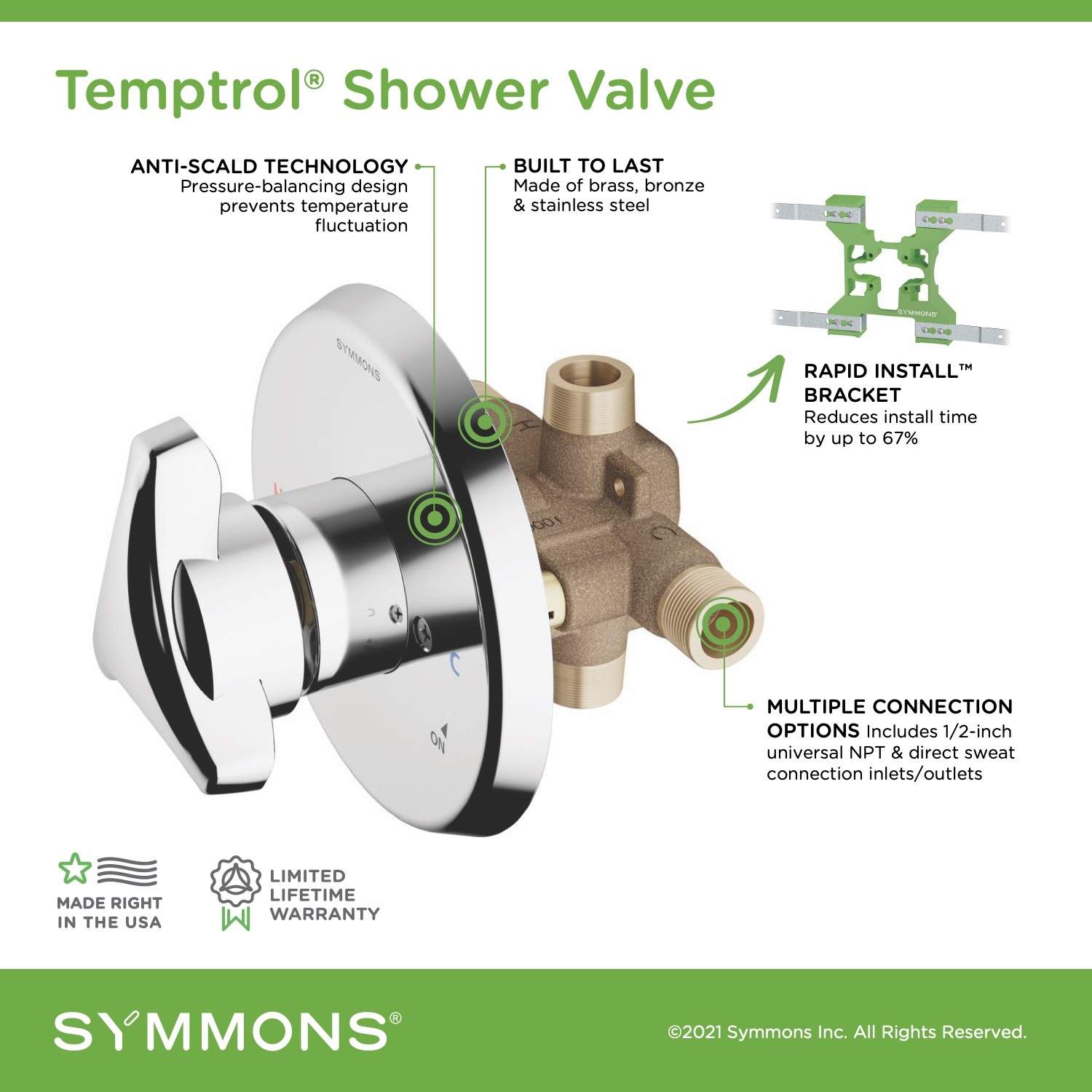The legendary Temptrol pressure-balancing, anti-scald mixing valve is the heart of every Symmons tub and shower system, and it is the benchmark by which all others are judged. Each valve is constructed of solid brass, bronze, and stainless steel, and features an adjustable piston that instantly and continually balances the hot and cold water pressure as demand fluctuates in the plumbing system. Now Temptrol is even easier to install with the Rapid Install bracket system for virtually any rough-in situation, and factory-installed options for various water supply connection methods.