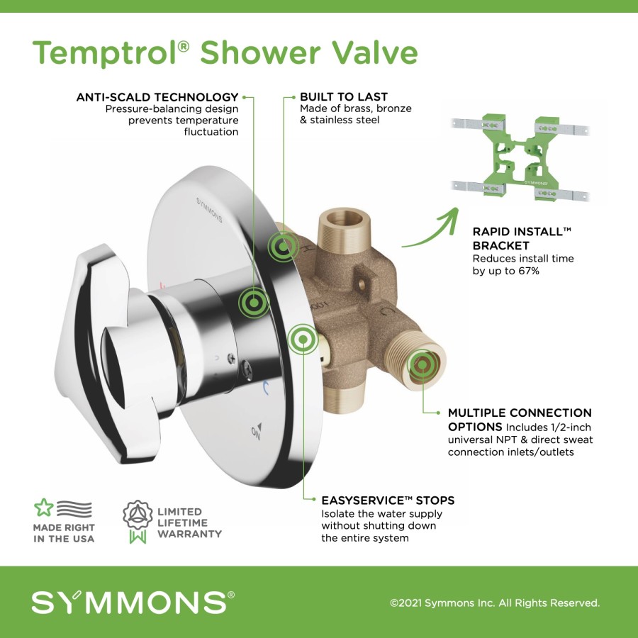 The legendary Temptrol pressure-balancing, anti-scald mixing valve is the heart of every Symmons tub and shower system, and it is the benchmark by which all others are judged. Each valve is constructed of solid brass, bronze, and stainless steel, and features an adjustable piston that instantly and continually balances the hot and cold water pressure as demand fluctuates in the plumbing system. Now Temptrol is even easier to install with the Rapid Install bracket system for virtually any rough-in situation, and factory-installed options for various water supply connection methods.