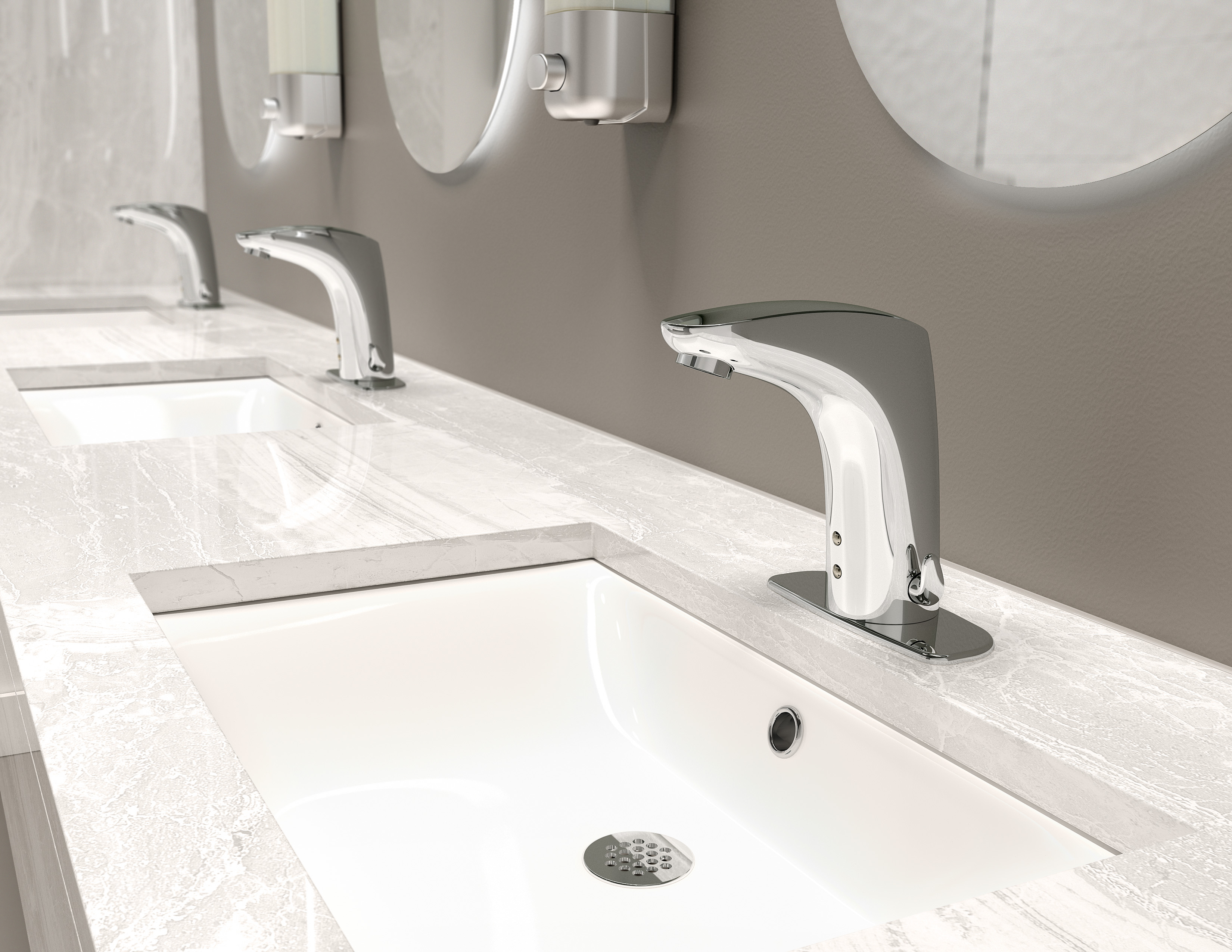 Ultra-Sense faucets offer touch-free operation for fully hygienic hand-washing solutions in commercial, educational, healthcare, and other public washroom environments. Ultra-Sense faucets use Position Sensitive Detection (PSD) for reactive control and to reduce wasted water. Ultra-Sense faucets utilize various battery or AC power options to adapt to any application.
